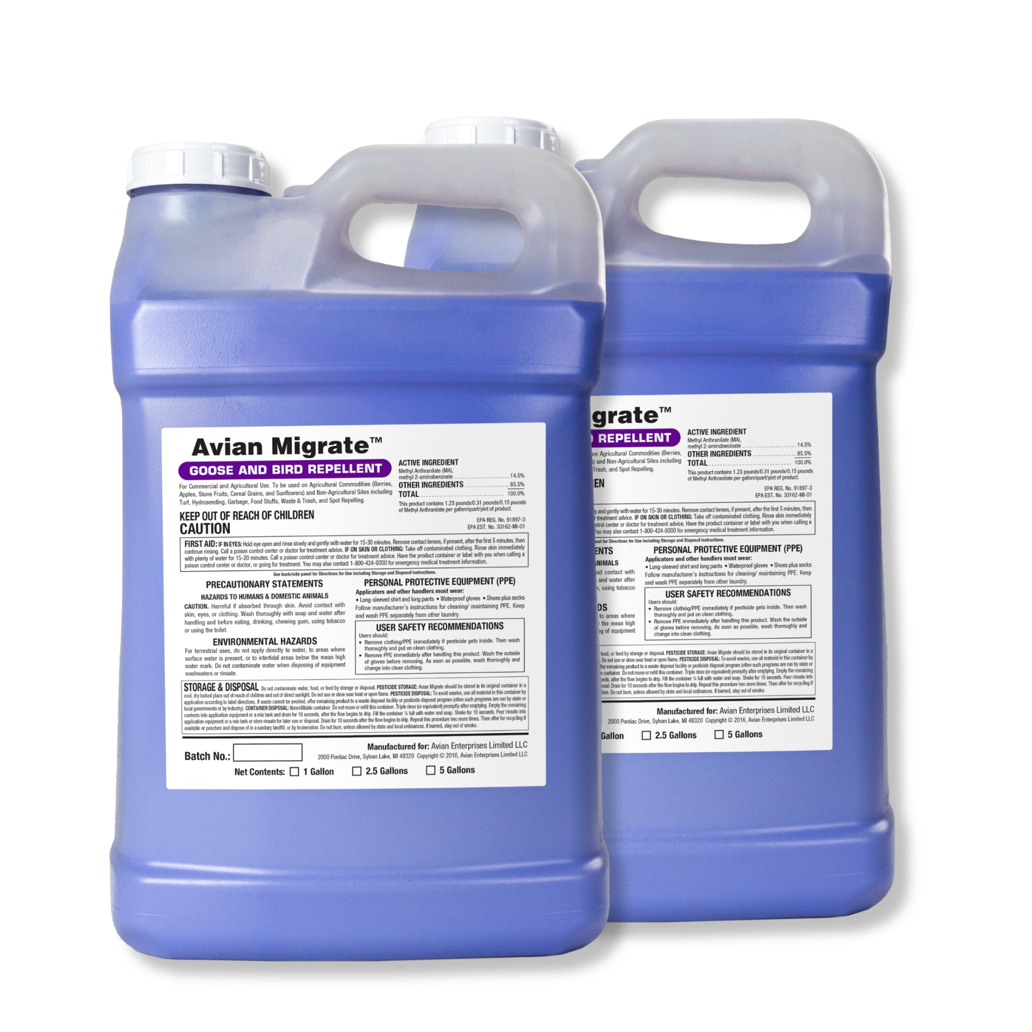 Tackle lawn & turf bird problems head-on. Avian Migrate® is the go-to choice for pest control operators, park managers, and commercial landscapers. The EPA-Registered repellent is specifically formulated to deter geese and other nuisance birds from athletic fields, parks, and other grounds and landscapes. The Methyl Anthranilate (MA) based formula creates a sensory irritation that trains birds to avoid treated turf. This approach provides lasting protection birds never get used to, reduces maintenance costs associated with droppings, and ensures a positive experience for patrons. For the best results, pair with Avian InvisiDye® UV Marker.